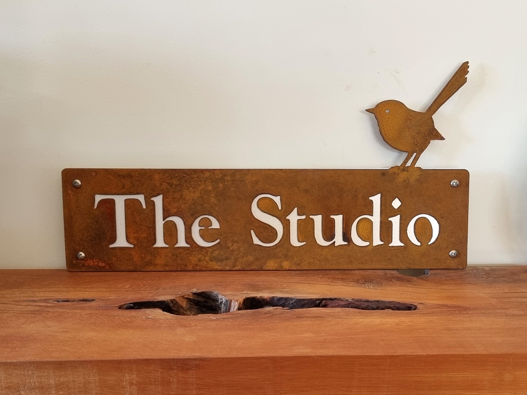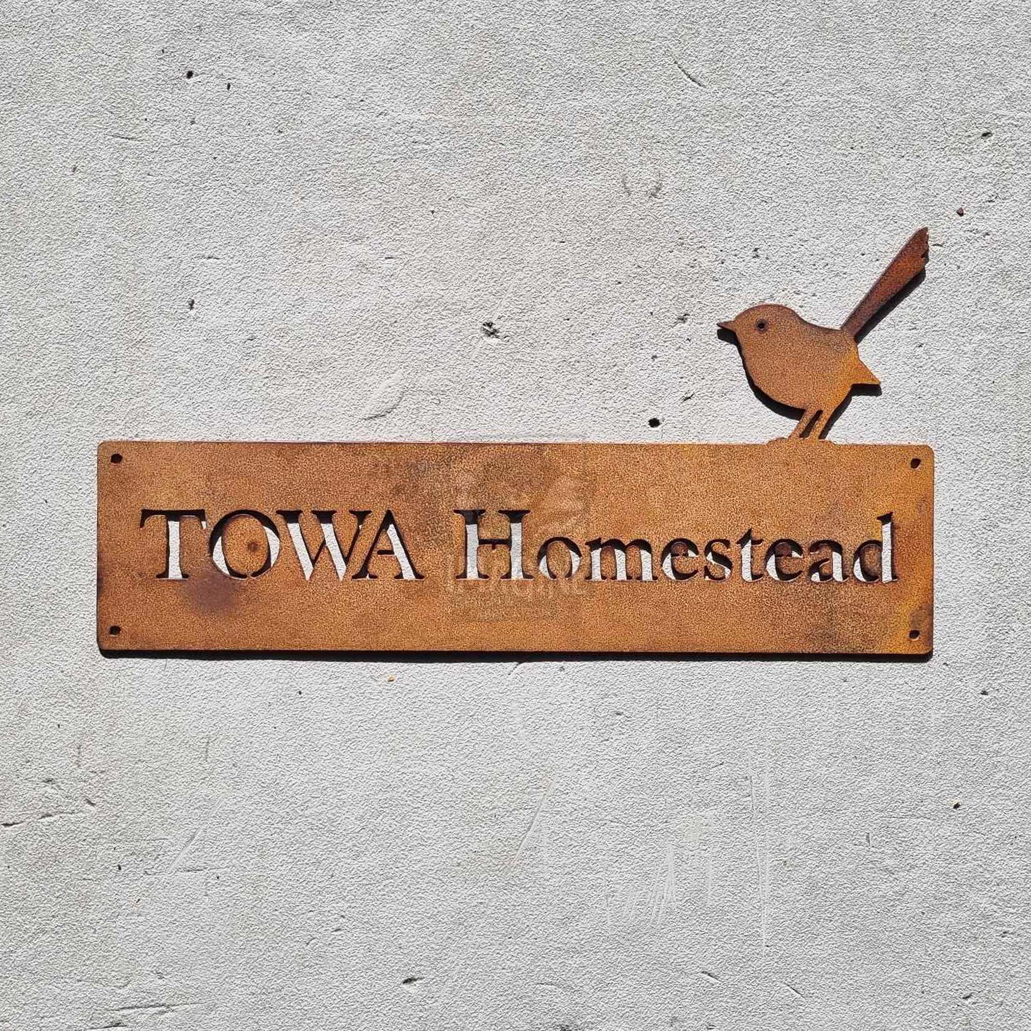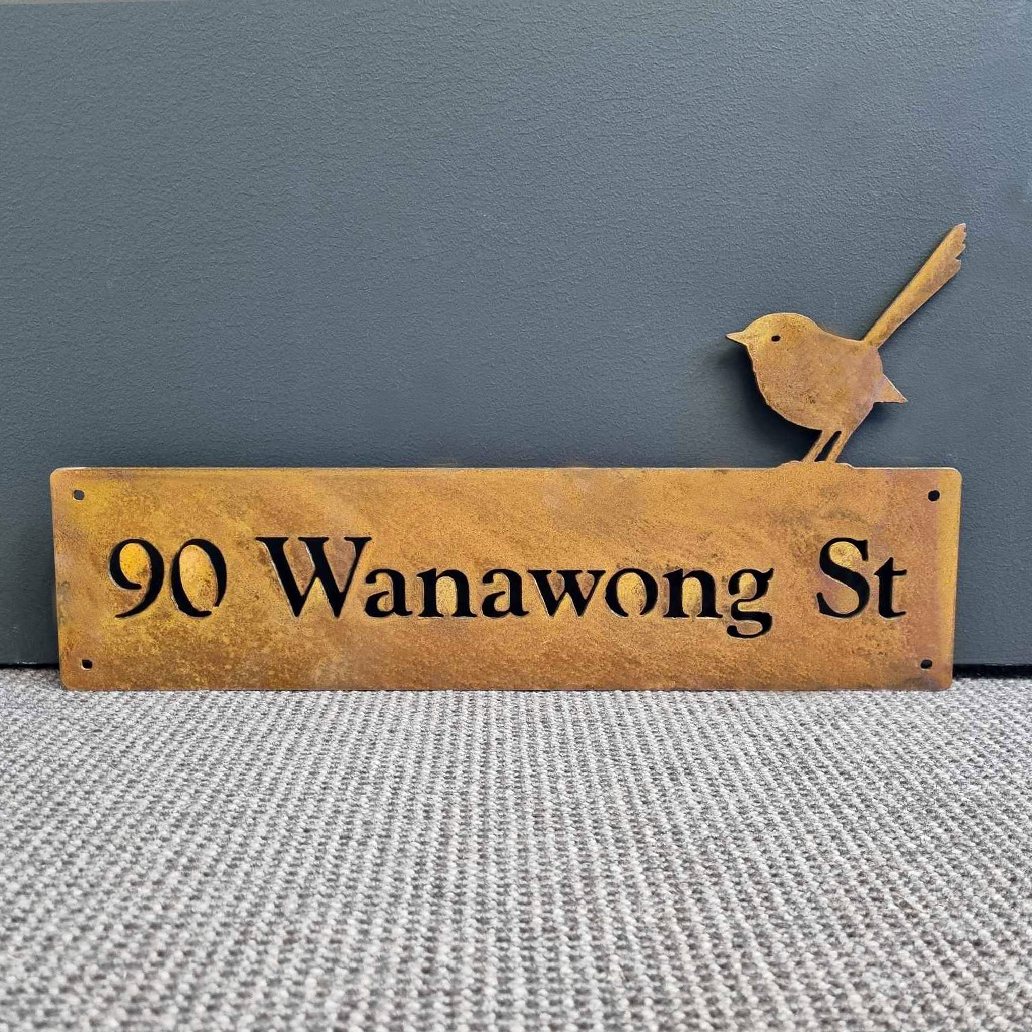 A beautiful addition to any home, this customisable Corten Steel (rusty) Fairy Wren Property Name Sign is a great way to dress up your entryway or fence. These signs are made from premium Corten steel which will develop a completely unique rusty patina on the surface as it weathers in the elements. Each sign has four mounting holes enabling fixture to a flat surface with screws or nails.